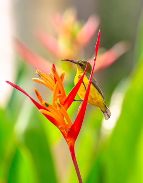 Olive backed Sunbirds loved to gather nectar from the Bird of Paradise in the garden at the resort we were staying in.