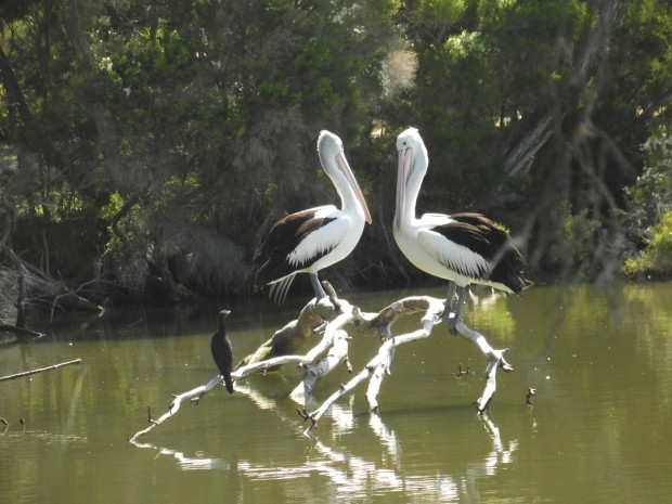 Two pelicans perched on a log in a lake facing each other.