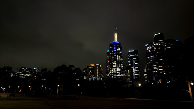 Birrarung Marr and the view of skyscrapers in Melbourne, at 11.13pm