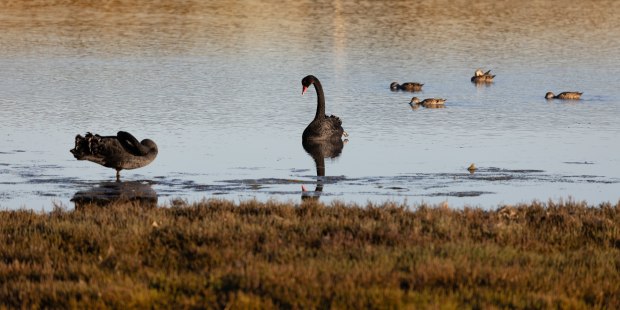 Tharanga Nanayakkara, Black Swans and Pacific Black Ducks sharing a pond (September theme: Things that fly)