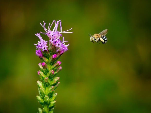 A Blazing Stars and the curious female Blue Banded Bee who did a fly by.
