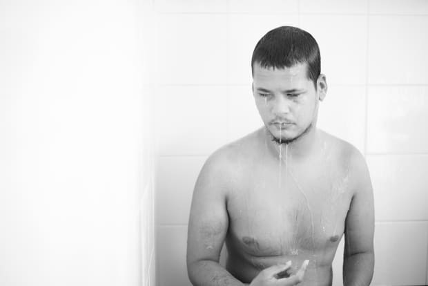 This is my disabled brother, he has cerebral palsy, epilepsy, he is blind, he can't talk, he can't walk, he is angry as he cannot communicate. Here he sits on the floor of the shower, what he is thinking we will never know.