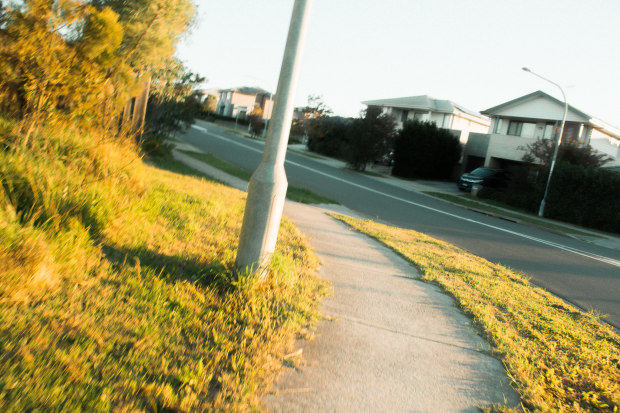 A photo of a unassuming street corner taken while turning. This photo was chosen for having an underdeveloped blur found mostly on one side of the composition and for its slanted jarring angle of the street post. A blank underexposed sky gives it a sense of disruption and confusion.