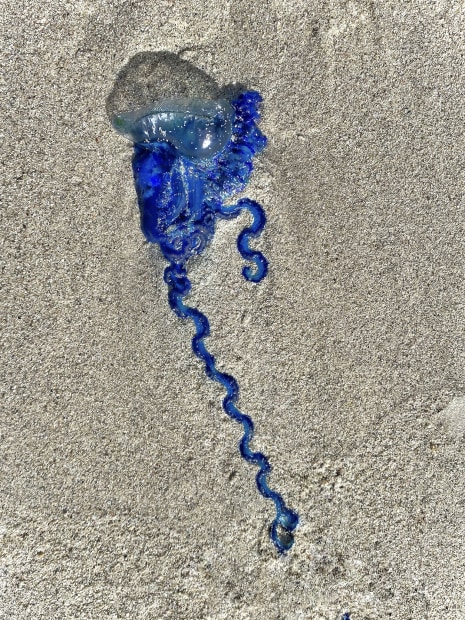 Changing currents sometimes cause a mass of Bluebottle Jellyfish to be washed up on the beach. One must exercise caution when stepping around them to grab a pic.