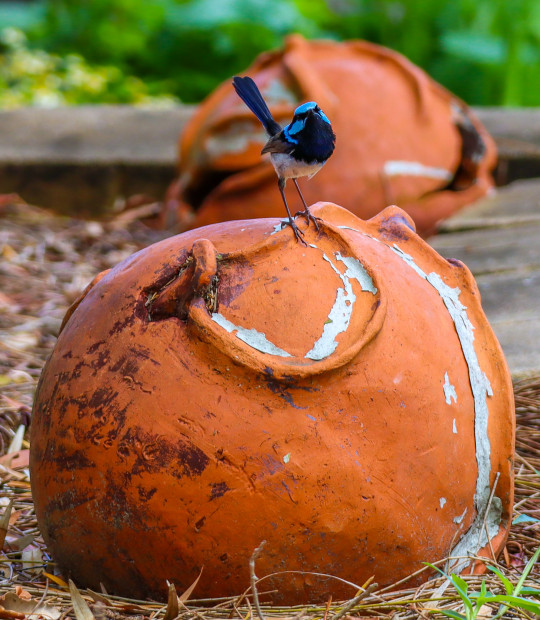 This blue wren was playing on my mum's old garden sculptures.