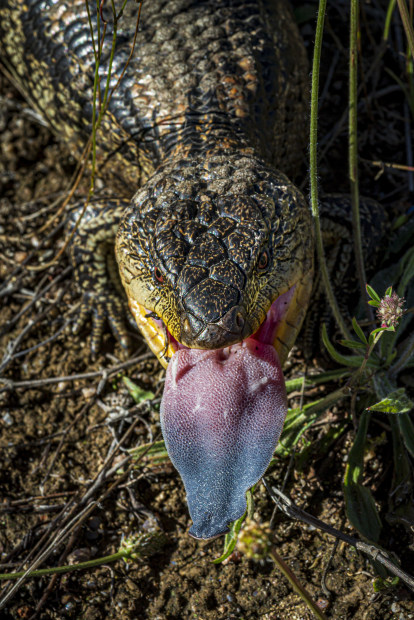 This was the largest blue tongued lizard I have ever seen. I was walking toward Yankee Hat in Namadgi NP, ACT and there it was on the track ahead of us, fending us off with hissing and the vivid blue tongue display.