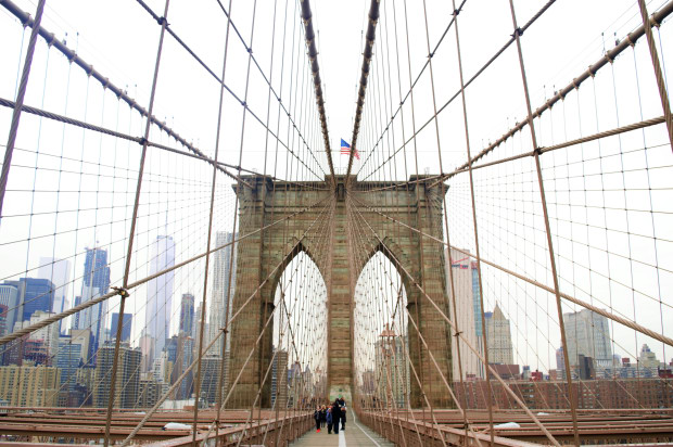 The Brooklyn Bridge with the famous New York skyline in the background.