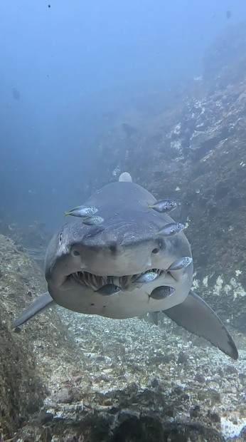 Upclose front on photo of a critically endangered Grey Nurse Shark taken at South Solitary Island, Coffs Harbour