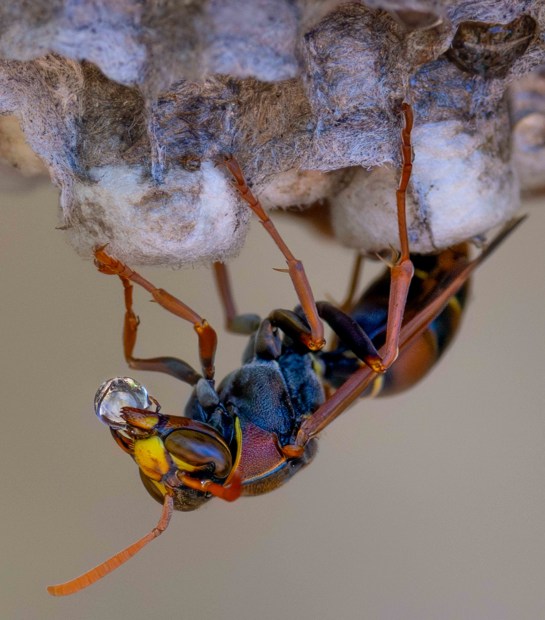 A Paperwasp blowing bubbles to cool down the larvae in its nest