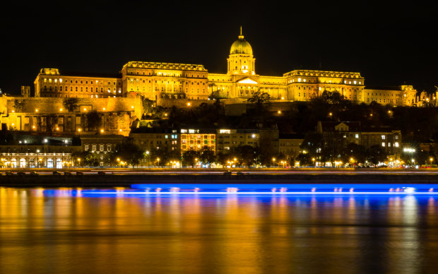 Light trail of a sightseeing boat on the Danube, with reflections of Budapest
