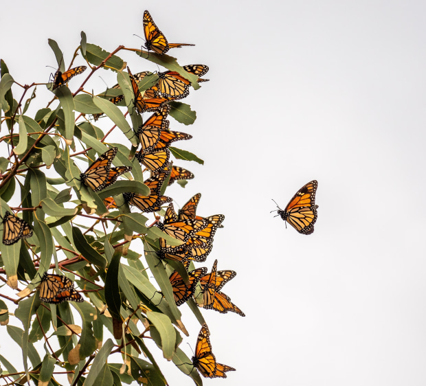 A butterfly makes a last minute flight to be with companions on a tree