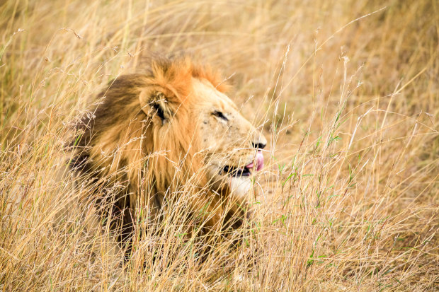 A lion is camouflaged amongst the grass at Masai Mara in Kenya