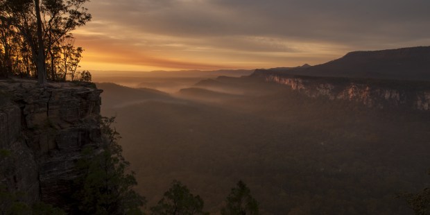 Sunrise lighting the mist in the Carnarvan national park, Qld.