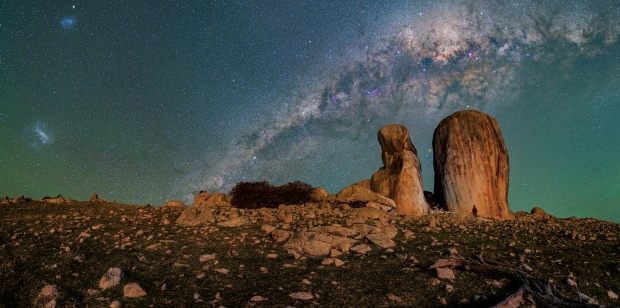 Castle Rock is a giant monolith south of Canberra, with nothing between it and the city to the north, so the whole face as you see it in the image is illuminated by orange streetlight (it's about 10k south). But then behind the rocks, away to the South and West, there's just nothing. To give a sense of scale I did a silhouetted shadow in one shot; I'm still figuring lighting out so it's not the most impressive effort. But it gives you a sense of how big this thing is, I would guess at about 25m easy. Many many shots went into the making of this mosaic. Tracked of course. The rock is on private property and I was kindly allowed by the landowners to go up for the night (and use the images); it was a pretty wild scramble down from the hill at about 3 in the morning. Didn't help that I was sick as a dog and had an injured hip. Ah the things we do for a photo... Exif Foreground about 180s at f4 ISO 2000 Sky 120s f3.2 ISO 2000 Skywatcher Star Adventurer Tracking Mount Samyang 20mm f1.8 Nikon d750