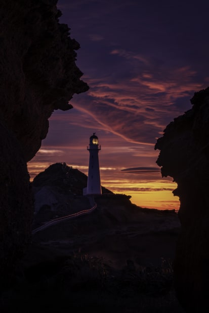 Intense fire-like colours fill the sky above the iconic Castlepoint Lighthouse, Wairarapa, North island, New Zealand.