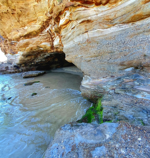 The entrance to the main cave at Caves Beach, Lake Macquarie. Surrounded by beautifully patterned rockface and water ripples.