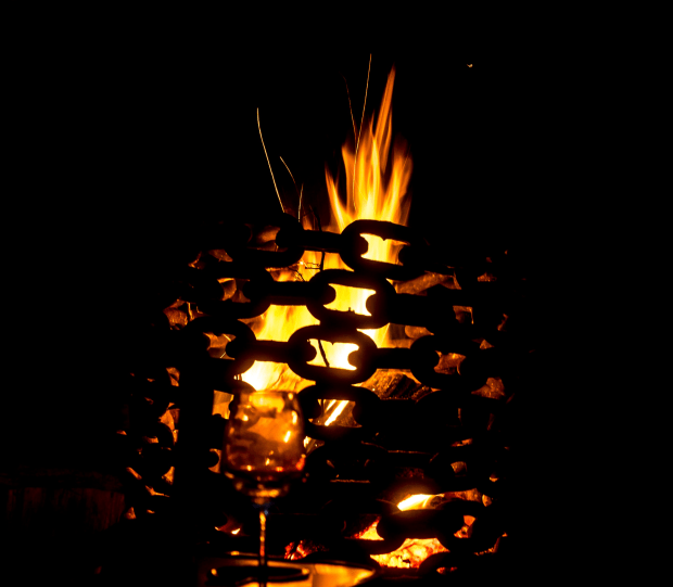 A glass of wine and a warm fire to keep out the cold in Tasmania. The eclectic Left of Field Campground at Mt Field