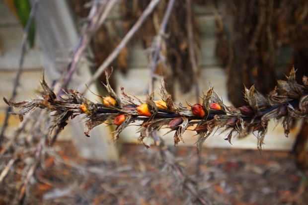 Finding the beauty in the changing of seasons as one plant stops blooming. Found on a walk through my local park.