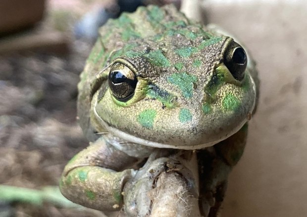 Our resident Motorbike Frog straddles a cardboard box outside to watch our three dogs eat their breakfast. Showing no fear at all.