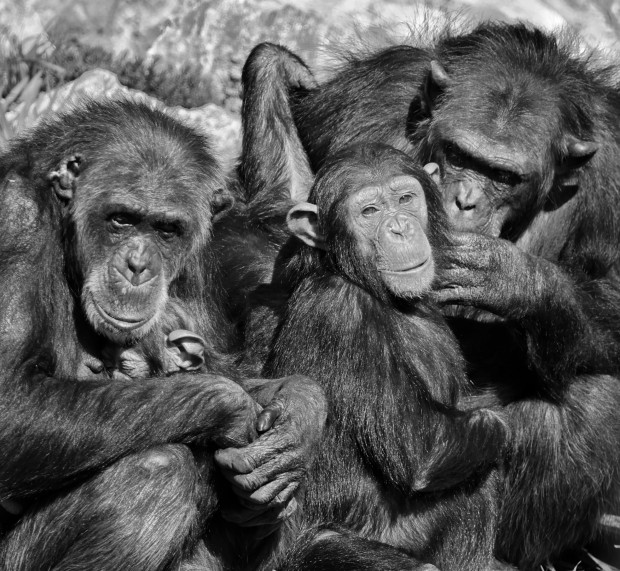 This chimpanzee family foursome cuddling up on a cold winters day.