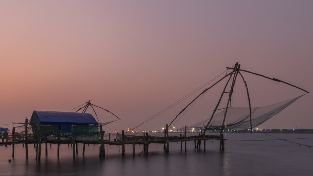Long exposure at sunset of the Chinese fishing nets at Kochi in southern India.