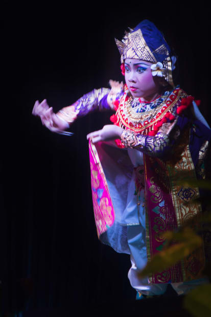 A young Balinese dancer (Cika) shows total involvement in the moment as she dances a traditional dance (Pala Wakia) in a village performance in North Bali.