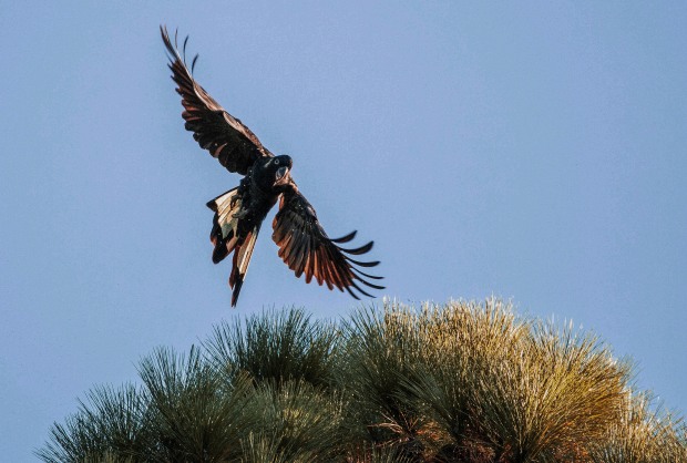 Yellow Tailed Black Cockatoo circling to land