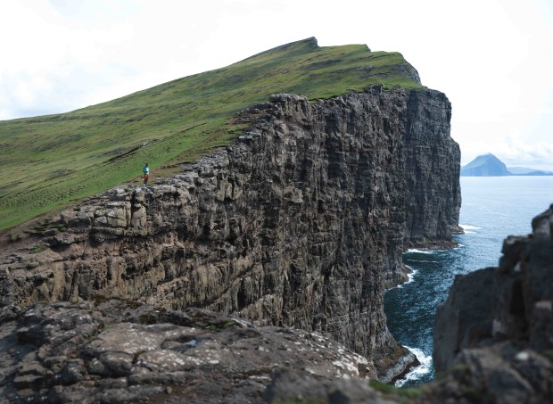 Vast cliffs on the west of the Faroe Islands. One hiker standing near the edge.