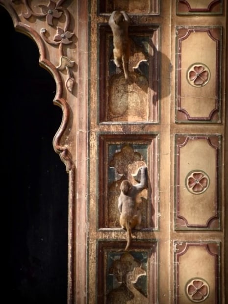 Against the backdrop of an intricately carved, timeworn door, two monkeys ascend—a living contrast to the stillness of history. The fading hues and ornate floral patterns whisper of an era long past, where craftsmanship met culture in a dance of design. Yet, life persists. The playful creatures navigate the aging façade as if retracing forgotten stories, blurring the lines between past and present. In this fleeting moment, nature and architecture intertwine, reminding us that even in decay, movement, curiosity, and life endure.