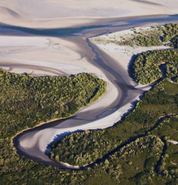An aerial perspective reveals a winding tidal channel carving its way through pale sand and dense green vegetation. The sinuous curves of the water create a natural rhythm, guiding the eye through the frame like a flowing brushstroke. Contrasting textures—soft sand, reflective water, and rugged plant life—combine to form an almost abstract landscape, where land and sea meet in a quiet, ever-changing balance.