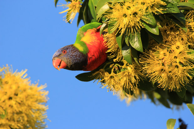 I LOVE THE VIBRANT COLOURS OF THE RAINBOW LORRIKEET AMONGST THE GOLDEN PENDA FLOWERS