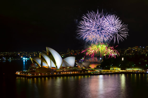 Fireworks from LA Boheme Sydney over Sydney Opera house. Shot on harbour bridge at the pilon