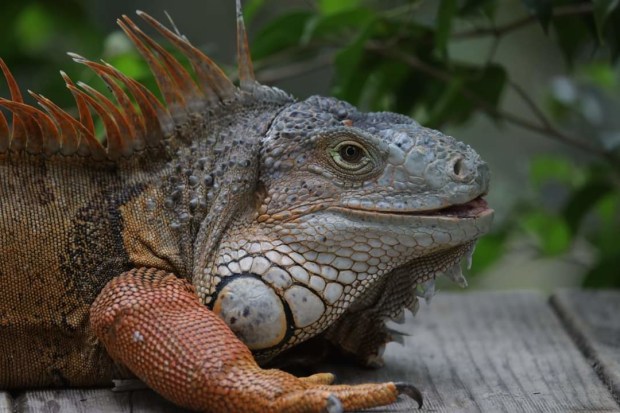 An Iguana showing the colours and the texture in the scales as it's relaxing on a deck