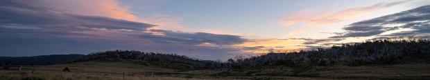 A wide angle view of the sunset over the Victorian high plains on an Autumn day. The snow gums glisten in the ever fading light.