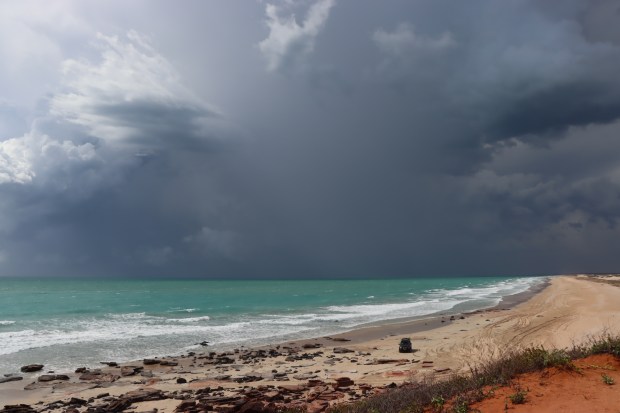 Red cliffs contrast with turquoise water and looming storm clouds.