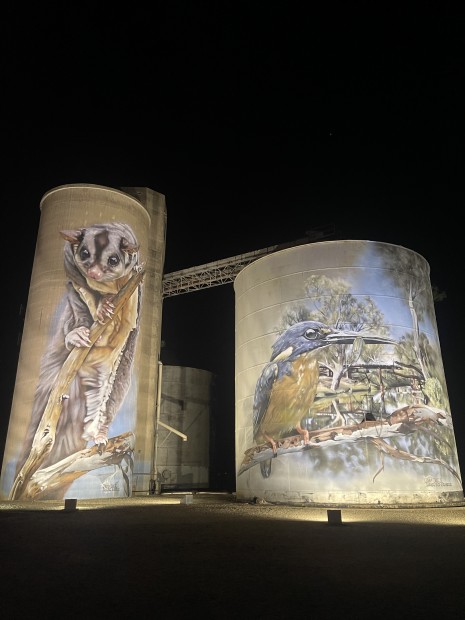 Sunrise behind gumtree, cattle, kangaroo sunset, silos at night