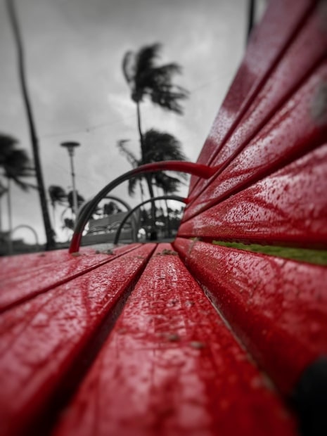 The seat’s bold red slats draw the eye with parallel lines, accentuated by glistening rain droplets that hint at nature’s influence on form. The gentle arc of the backrest introduces a rhythmic curve, contrasting with the tall palm silhouettes swaying in the background. This interplay of color, line, and texture invites the viewer to pause and appreciate the quiet geometry of everyday seating.