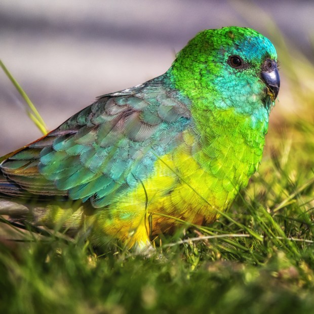This sweet little Turquoise Parrot (similar in size to a budgerigar) allowed me to crawl around nearby to take photos of him feeding at sunset. Even though he was coy he seemed to enjoy the attention.