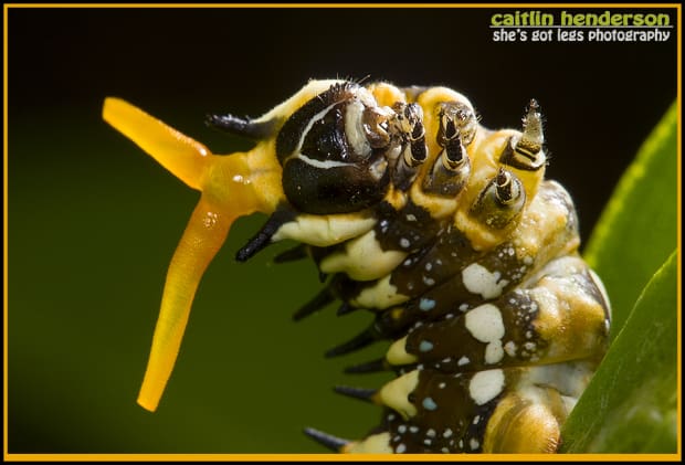 This Dainty Swallowtail caterpillar has a hidden secret. The forked orange structure is called an osmeterium, and it is normally tucked away inside the body. When threatened, the caterpillar throws back its head and appears to grow a snake-like tongue, excreting a bad smell like rotten fruit.