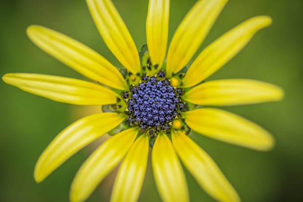 The simple but beautiful daisy. The vivid yellow lines lead into the complex blue centre.