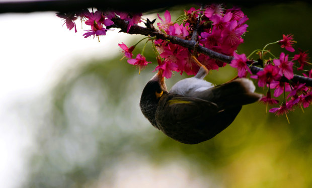 A noisy miner dancing among the cherry blossoms.