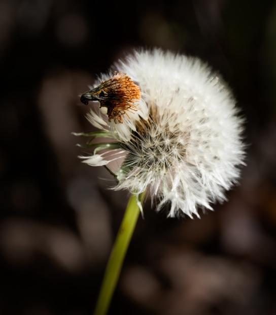 Some plant matter had landed on the dandelion head in the garden creating an intriguing combination.