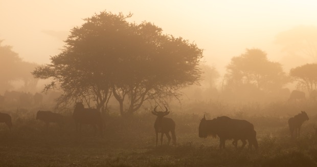 A morning safari provided a herd of wildebeest in an unexpected mist as the sun was rising.