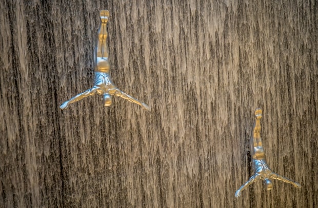 Divers appear to plunging down a waterfall when in fact they are figurines mounted on a huge wall display in an international airport.