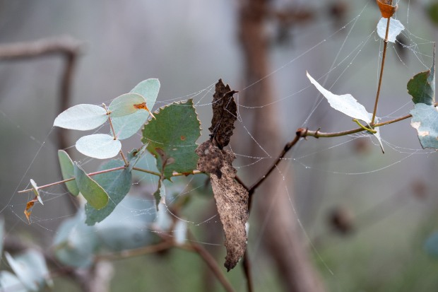 Colour photograph of morning dew on the delicate threads of a spider web hanging between leaves