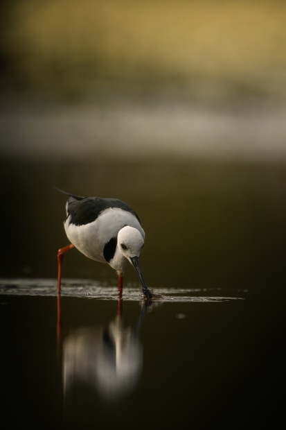A Pied Stilt catches a tiny fish from a inch-deep lake in the Coombabah Lakelands on the Gold Coast of Queensland. After a long dry spell (despite the humidity), the lake retreated so far that less than a third of it's usual surface was covered with water. While this meant catching fish became easier, it meant that those fish became smaller and smaller as the stocks were depleted. To capture this shot, I hid in the thick vegetation by the shore for half an hour or so. This meant the stilts began to ignore my presence and approach the deeper part of the lake near where I was positioned. I then waited for one of them to strike so I could capture the moment it caught one of the small remaining fish.