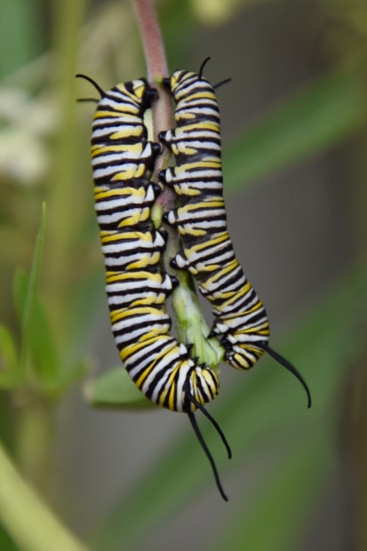 Monarch (Wanderer) Butterfly caterpillars sharing a meal.