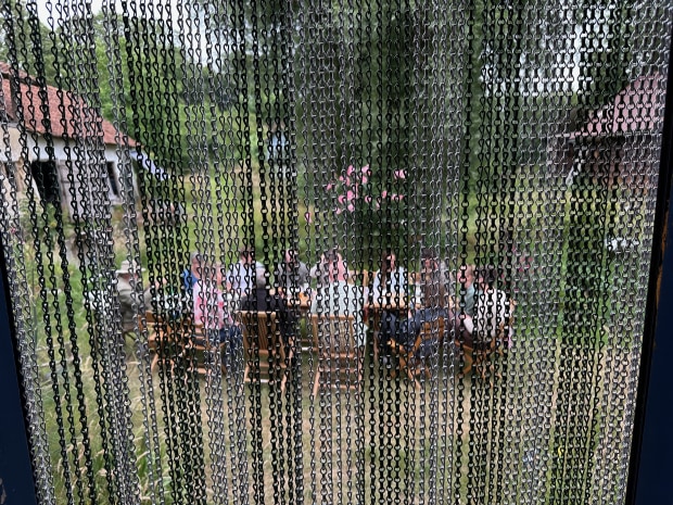 my family eating outside through the fly curtain on the door