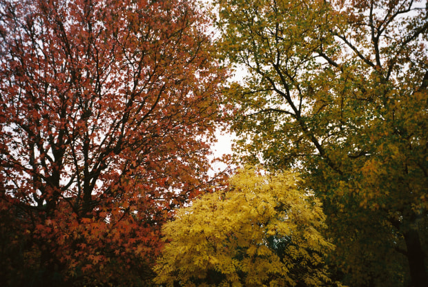 Autumn colour on display in suburban Victoria. Various leaf pigments expressed by two different species of deciduous broadleaf tree. Chlorophyll no more(o'phyll). Showing off as they turn off for a nap.