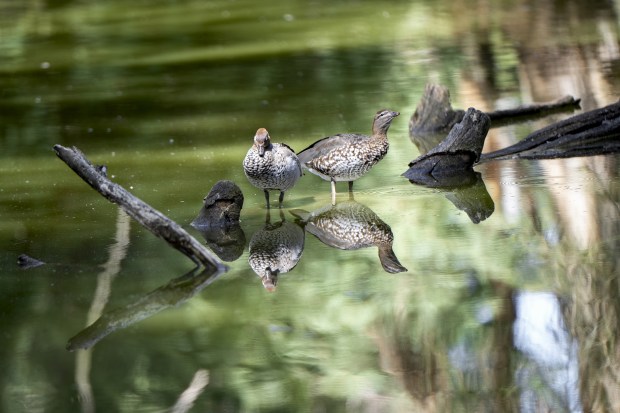 A pair of wood ducks enjoying a pond at Cleland Wildlife Park in Adelaide